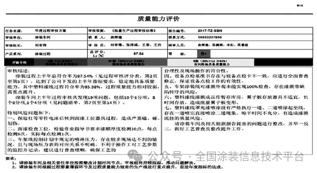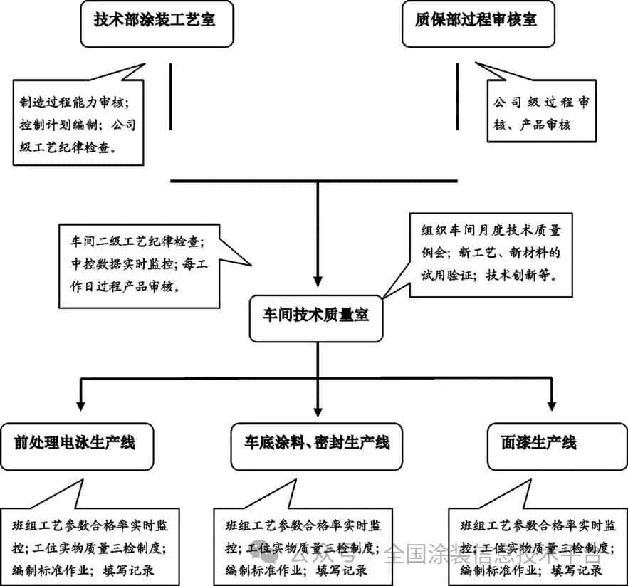 涂装车间工艺技术的管理,需要从公司职能部室、车间、班组建立起三级管理框架体系,其中公司级的包含工艺纪律检查、过程审核、控制计划编制、制造过程能力审核;车间级的包含工艺纪律检查、中控数据实时监控、过程产品审核、月度技术质量例会、新工艺、新材料的试用验证、技术创新等;班组级的有工艺参数合格率实时监控、工位实物质量三检制度、编制标准作业、填写各项记录等。